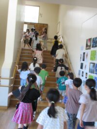 今回は水平避難が難しい状況を想定し、1・2階で学習している児童が3・4階へ垂直避難する訓練を行いました。真剣に行動する姿が見られました。