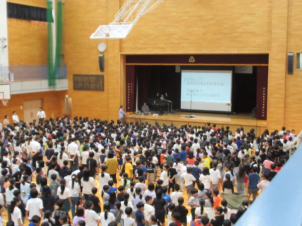 本校の校歌を作曲してくださった平林龍さんが来校されました。全校児童で「見えない羽根」を歌い、部分ごとに収録を行いました。最後には、全員で美園小の校歌を元気に歌い上げ、体育館いっぱいに美しい歌声が響きました。