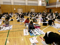 1月9日(金)、体育館で書きぞめ競書会を行いました。3年生が書く字は「こうま」。新しい年の始まりにふさわしい言葉を、心を込めて書きました。練習した成果を発揮しようと、一人ひとりが真剣な表情で取り組み、「とても上手に書けた!」と満足そうな声も聞こえてきました。