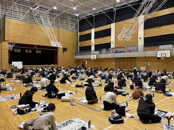 1月13日(火)、体育館で小学校生活最後の書きぞめ競書会を行いました。6年生が書く字は「出発の日」。卒業という新たな門出を目前に控え、一筆一筆に「出発の日」への決意を込めて丁寧に筆を走らせていました。