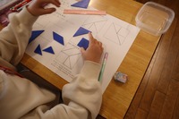 三角や四角のブロックを使い、決められた枚数で四角が作れるかの授業でした。